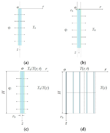 In the thermal problem schematized in Figure 1, Equation (1) should be solved in each domain (i.e., soil, grout, and tube wall) with appropriate boundary conditions (BCs) and initial conditions (ICs). A good number of models have been developed in order to solve the partial differential equations in Equation (1) by analytical or numerical means or a combination of the two. Each model is based on some kind of approximation that reflects a simplified formulation of an equation set (including Equation (1) and preset BCs and ICs). There are inherent differences in the basic assumptions, BCs, and ICs between these models, and even for the same model, different solution methods can lead to different results.
