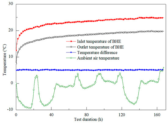 The technology of the TRT itself has many sources of uncertainty [39]. PEs should be derived from the same data set when obtaining different PE results using the six selected heat transfer models for a comparison run. Other influential factors, such as the simulation starting time, should also be in accordance. The experimental data set was collected from the existing literature. The test was performed by researchers in the Laval University [40]. The temperature responses were recorded every 300 s for 168 hours at a constant rate period using a high-precision temperature sensor with an error of ±0.1 °C and flow meter with an error of ±1%. One reason for choosing this set of data is that it contains local climatic data, which are suitable for obtaining more accurate PEs based on the FLSCC and DST. The tested borehole had a depth of 140 m and a radius of 0.076 m. An average heat transfer rate of 66.49 W/m was injected into the ground with an undisturbed temperature of 7.5 °C. The volumetric specific capacity of the soil was about 2.25 × 106 J·K−1·m−3. The test results are shown in Figure 4. In the first several hours, the heat transfer process was unsteady, and the ratio of temperature change was large, so the temperature points in the first 13 hours were screened out.