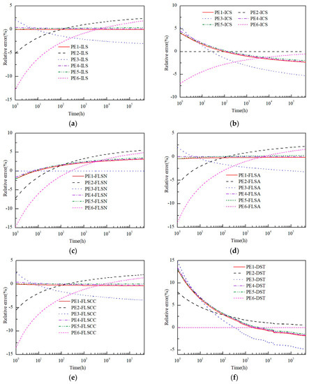 Figure 5a shows that PE6 causes up to a 15% relative difference in the very beginning compared with PE1. PE2 and PE3 cause around 5% relative differences in the beginning hours and at the end of system operation, while the relative difference due to the use of PE4 and PE5 is always within 1% from the beginning to the end. Similar conclusions can be drawn from Figure 4d,f. This is because the parameters estimated by these three models have little difference.