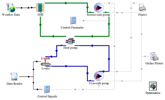 The DST has been used to realize PE in a few studies with the help of the GenOPT package (a generic optimization program) [32]. For example, Witte et al. [33] adopted the DST to estimate the thermal conductivities of soil and grouting materials. Zhang et al. [20] also presented a simulation-optimization approach for determining the optimal thermal conductivity and the specific heat capacity of soil. There are four kinds of DST components in the TRNSYS software; two of them are applicable to U-pipe configuration, and the other two are suitable for concentric tube configuration. The identifying numbers of the U-pipe components are Type557a and Type557b, respectively. Both of the above methods employ Type557a component (in which the borehole thermal resistance is calculated by a theoretical formula) together with the Hooke–Jeeves optimization algorithm. In contrast to their approaches, a Type557b component (in which the borehole thermal resistance is defined by the user, and the value used in this work is from TRTPE) was applied in this study [34], the layout of which is shown in Figure 3. Using Type557b makes it convenient for us to investigate the influence of PE on the BHE design. PE methods based on the DST, as well as the other five models, are introduced in the next paragraph.