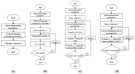 Software-based methods are somewhat more complicated because they often employ a more complex underlying model that can more realistically consider load representation, bore field geometry, borehole configuration, soil and fluid thermal properties, and dynamic heat pump characteristics, among other factors. Herein, this kind of method mainly refers to those methods in which monthly or hourly loads are used, not only software or simulation tool-based ones. These design tools or simulation programs compute the mean fluid temperatures of the heat pump(s) after inputting the system parameters and then compare the simulated minimum or maximum fluid temperature of the heat pump(s) with the user-specified constraint values. The smallest length that satisfies the requirement is sought iteratively. A number of design and analysis computer programs are available—such as EED, GLHEPRO using Eskilson’s non-dimensional temperature response factor g-functions [5], and TRNSYS software with the embedded duct ground heat storage model (DST) component developed by Pahud and Hellstrom [6,7].