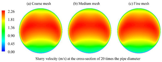 The resolution of the grid is a significant factor to influence the numerical result during the computational study of the sand transport and deposition in multiphase flow pipelines. The coarse mesh of 121,080 cells, the medium mesh of 203,490 cells and the fine mesh of 466,820 cells were employed here to test the sensitivity of the grid resolution on the numerical simulation. The slurry velocity at the cross-section of 20 times the pipe diameter was selected as a rational parameter to evaluate the effect of the grid resolution on the flow behaviour. The comparison results were shown in Figure 2 and Table 2, respectively. From the contours of the slurry velocity in Figure 2, it can be observed that these three different mesh cells predict almost the same distribution of the slurry velocity at the cross-section of 20 times the pipe diameter. Table 2 lists the computed slurry velocity at the central point of the cross-section of 20 times the pipe diameter under different gird cells. We can see that the relative errors for coarse mesh and medium mesh are 0.40% and 2.24%, respectively. Therefore, the medium mesh of 203,490 cells was used for the numerical simulation of sand transport and deposition in multiphase flow pipelines considering the computational cost and accuracy.