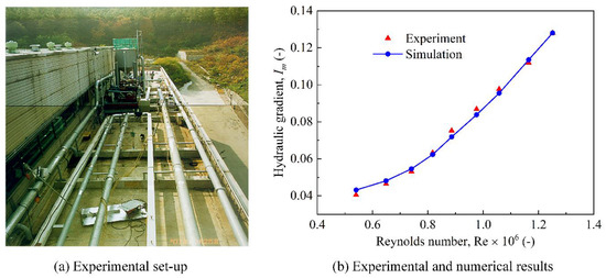 Effect of Reynolds number on the hydraulic gradient in sand-slurry flows (a) Set-up for experiments [32] and (b) comparison between experiments [32] and simulations.