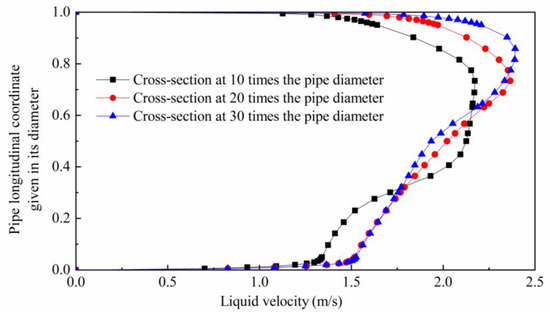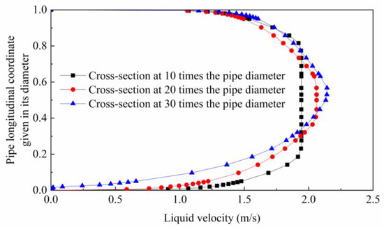 Liquid velocity at different cross-sections, vin = 1.8 m/s, d = 50 µm, c = 5%.
