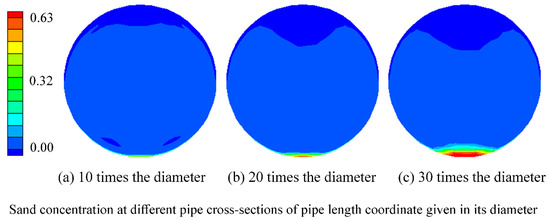 Figure 6 shows the sand concentration at different cross-sections away from the inlet of the pipeline. The initial computational condition included the sand concentration of 5%, the sand diameter of 50 µm and the slurry velocity of 1.8 m/s, respectively. It can be seen from these concentration contours that the sand can hardly settle in the pipe bottom within the distance of 10 times the pipe diameter from the pipe inlet (Figure 6a). After that, the sand begins to deposit as a result of the effect of the gravitational force along with the flow direction. In these simulation cases, the sand deposition was observed at the cross-section of 20 times the pipe diameter (Figure 6b). The deposition of the solid sand can be obviously found when the distance from the pipe inlet reaches 30 times the pipe diameter (Figure 6c). In other words, the thickness of the sand deposition is very small and it accordingly could be ignored, when the sand travelled less than 10 times the pipe diameter. Nevertheless, the deposition thickness reached approximately 10% of the pipe diameter, when the sand travelled about 30 times the pipe diameter in this simulation case.