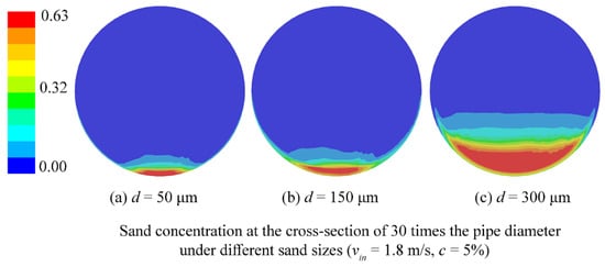The effect of the particle size on the sand deposition was numerically simulated at the inlet velocity of 1.8 m/s with a sand concentration of 5%. The detailed inputs for the numerical stet-up are listed in Table 4. The sand diameter is assumed to be 50 μm, 150 μm, and 300 μm, respectively. The results of the sand concentration are shown in Figure 7 at the cross-section of 30 times the pipe diameter. We can see that the height of the sand bed in the pipe bottom is small when the particle diameter is less than 50 μm. However, the height of the sand bed increases rapidly and it is even approximately equal to one-third of the pipe diameter when the sand diameter reaches 300 μm. Under this condition, the slurry flow cannot carry the coarse sand and correspondingly the severe deposition occurs in this low velocity of 1.8 m/s. It indicates that the sands cannot be carried by the liquid and the deposition will inhibit the flow assurance, especially for the subsea multiphase flow pipeline system.