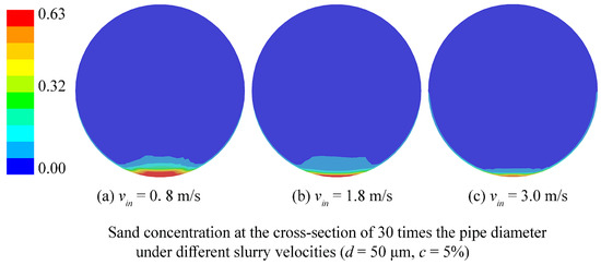 Sand concentration contours at the cross-section of 30 times the pipe diameter under the condition of different inlet slurry velocities (d = 50 μm, c = 5%).