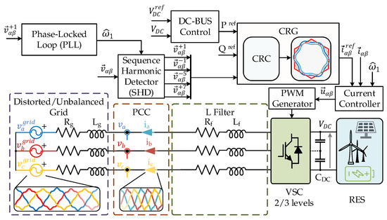In order to accomplish the control objective, a multifrequency current controller is employed for tracking the most common sequences in distorted grids . As it is shown in Figure 1, the control is divided in three steps—(1) PCC voltage sequence harmonic detection (SHD); (2) Current reference generator (CRG); (3) Current controller. Besides, the control scheme also counts with a PLL to get a frequency-adaptive solution. It is well-known that frequency variations produce THD degradation [24] which avoids the control objective achievement, that is, null active power oscillations.