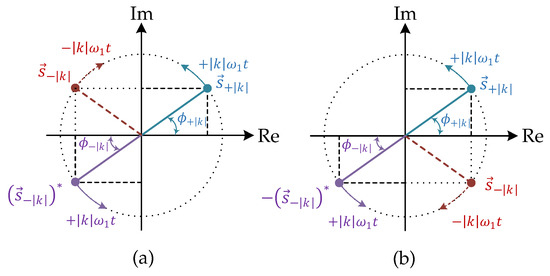 where and are the initial phases of the corresponding voltage and current vectors, respectively. Please note that two possible combinations are feasible between voltage and current harmonics depending on the sign of k. The previous definitions have been carried out considering .