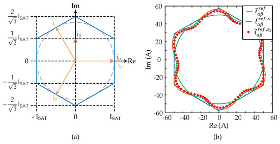 (a) Maximum peak limits (blue solid line) and maximum module limit (purple dashed line) in stationary reference frame (StRF); (b) Saturation example for maximum module saturator, , and maximum peak current saturator (MPCS), , when and