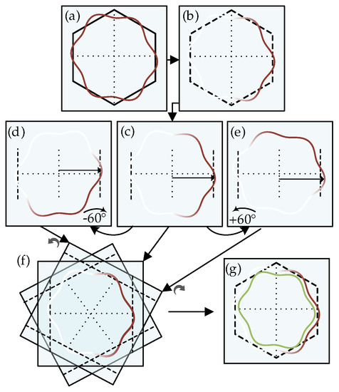 Trajectory rotation process example. (a) Full-trajectory. (b) Half-trajectory. (c) Trajectory comparison with left and right edges. (d) and (e) Comparison of rotated trajectory (). (f) Trajectory rearrangement to get the full hexagon. (g) Optimal is obtained.