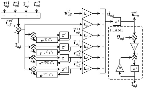The selected current control structure is depicted in Figure 5, which is basically a multi-resonator at the frequencies of interest. The plant model is discretized by applying a Zero-Order Hold (ZOH), so the half sample delay from the PWM dynamics is already included. The one sample computational delay induced by the digital controller actuation voltage is also included as a state. In conclusion, the augmented plant can be expressed in state-space form as