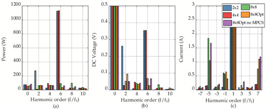 Steady-state analysis of each configuration by means of—(a) FFT of measured power at the PCC; (b) FFT of the DC-BUS voltage (Zoom in low values); (c) FFT of the three-phase current at the PCC (Zoom in low values).