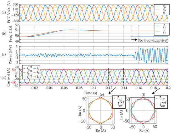 Analysis of frequency-adaptive scheme: (a) PCC voltage; (b) Estimated and real FPS; (c) Power exchange at the PCC; (d) Current at the PCC; and trajectory in the complex plane of the current and its reference with (e) frequency-adaptive scheme (f) non frequency-adaptive.