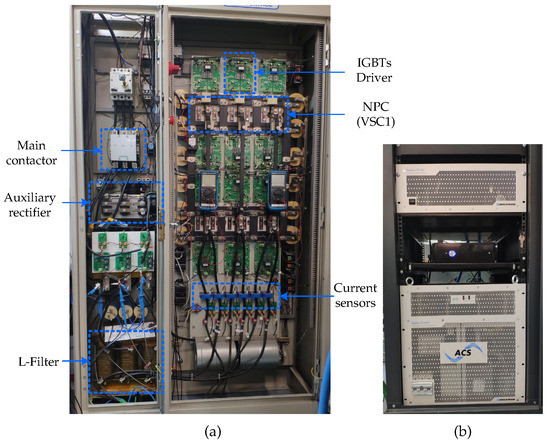 Experimental setup: (a) NPC power converter. (b) Regatron Topcon Quadro programmable power supply.
