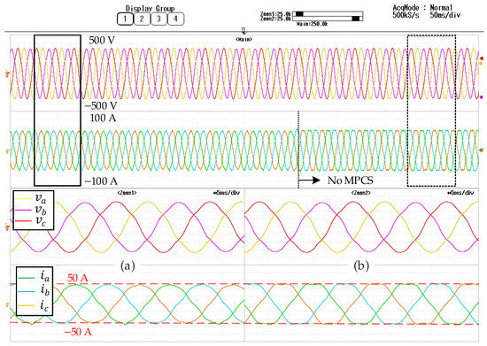 Figure 11 shows the experimental test from simulation in Figure 7. The figure zooms in the period when MPCS is employed (a), and when it is not (b). It proves how the harmonic distortion increases when the MPCS is not operating with past samples. The corresponding HD value has been underlined in Table 5 to note that it is over the maximum allowed. The harmonic active power does not increase a lot in the case under study, but the HD optimization has been wasted. Therefore, the application requires the MPCS to be correctly addressed.