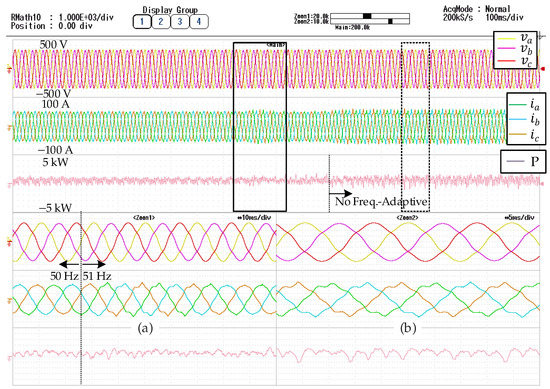 Experimental results delivering capacitive reactive power. Lowpass filter with a cutoff frequency of 1.5 kHz has been applied. (a) Zoom in voltage, current and three phase active power at the PCC when the grid frequency changed; (b) Zoom in voltage and current at the PCC without frequency-adaptive scheme.