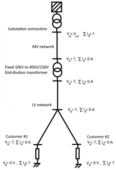 An example of a small medium voltage/low voltage (MV/LV) network connected to a substation transformer. While the MV network is always operated radially, the LV network is operated meshed in some areas. The reference voltage () is defined at the secondary side of the substation transformer. If only the LV network is considered, the reference voltage () is defined at the secondary side of the distribution transformer.