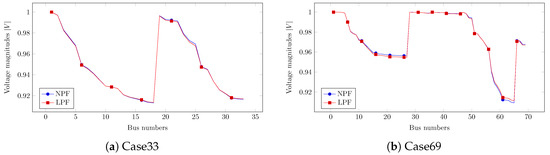 Comparison of NPF and LPF computations for voltage magnitudes of all buses in two test networks Case33 and Case69.