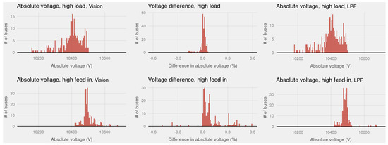 Histograms of the comparison between the LPF model and the commercial Vision network design tool of the network of substation Rauwerd. The left column shows a histogram of the absolute network voltages as calculated by the LPF model, showing the severity of the voltage drop in the network compared to the nominal voltage of 10,500 Volt. The right column shows the histogram of the difference in absolute voltage between results of the LPF model and Vision.