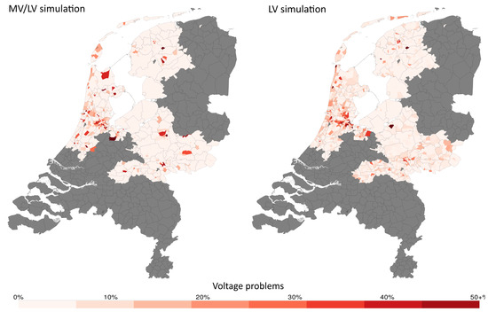 The resulting geographical distribution of voltage problems is displayed in Figure 5. Moreover, the absolute number of voltage problems in the MV/LV simulation is 150 thousand, 5% of the total number of customers. The absolute number of voltage problems in the LV simulation is 180 thousand, 6% of the total number of customers. While these percentages are low, they are still very significant as voltage problems can be quite costly to solve.