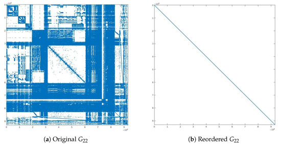 By analyzing matrix , we observe that is a sparse and Symmetric and Positive Definite (SPD) matrix. Due to its SPD properties, we can use NA techniques that are developed for this type of matrices such as the Cholesky decomposition, Incomplete Cholesky (IC) and the Conjugate Gradient (CG) iterative method on . In addition, some reordering techniques such as Reverse Cuthill-McKee (RCM) and Approximate Minimum Degree (AMD) permutations could improve the properties of as well. Figure 6 shows the sparsity structure of and reordered using RCM.