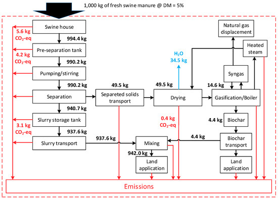 The scope of proposed swine manure management scenario illustrating mass balances and emissions flows (Note: black arrows represent main product flow; red arrows represent direct and indirect greenhouse gas (GHG) emissions. Blue arrow represents water evaporation. Numbers in red are direct emissions of GHG in kg CO2-eq).