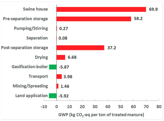 Evaluating emissions and impacts associated with this conversion strategy, i.e., gasification of swine manure solids, can facilitate adoption and expand the set of technologies available to livestock producers for manure management. Life cycle assessment (LCA) is an essential tool to assist decision-makers by evaluating the environmental performance of proposed management strategies. According to ISO standard 14040 [9], LCA considers the various input and output flow, and the corresponding environmental burdens, resulting from production, consumption, and disposal of associated product systems. Energy recovery from swine manure incineration was found to be a promising pathway to reduce GHG emissions associated with manure management [10]. Several LCA studies have reported on the performance on anaerobic digestion as manure management and energy recovery as a sole feedstock or in combination with other biomass streams [11,12,13]. Wu et al. [10] performed an LCA comparing GHG emissions between land application and gasification as manure management practices. The study showed that gasification has high potential to reduce GHG emissions due to the environmental benefits of syngas production and biochar application to crop field. Biochar also has been used for carbon sequestration, soil amendment and biomass waste management [14].