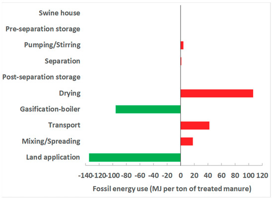 From GHG emissions and energy use perspectives, the land application step of swine manure management appears beneficial due to the credits from replacing synthetic fertilizer consumption. However, in regions of intensive swine production where manure land application regulations are strict, thermochemical conversion can be an alternative approach to utilize manure. Adopting innovative sludge drying technologies, i.e., biodrying technology [16], can significantly reduce the drying energy demand, and consequently, the GHG emissions. Also, more studies towards a better understanding of biochar agronomic value could potentially help in incentivizing the thermochemical conversion of swine manure solids.