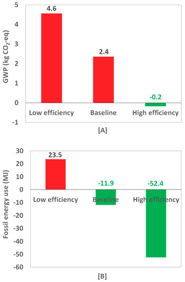 Impacts of gasification-boiler performance on (A) global warming potential (GWP 100a), and (B) fossil fuel energy use (MJ).