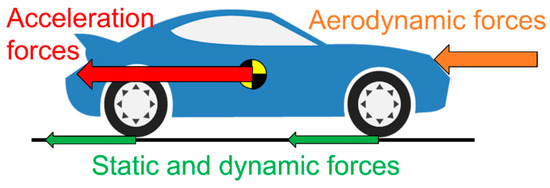 Equation (12) has four terms. The first term is the acceleration torque (needed to move the mass of the vehicle and wheels), the second and third ones are the static and dynamic friction torque, respectively, and the last one is the aerodynamic torque. The forces that cause these torques are represented in Figure 3.