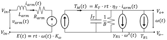 Last, to obtain the input impedance, the working points of D, and Iarm must be calculated. To achieve it, the steady-state circuit shown in Figure 21 is used together with the electric motor mechanical equations.
