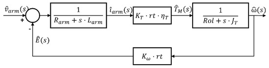 Figure 4 shows the model of the electric motor, being ω(t) the angular speed of the wheels (rad/s), TM(t) the motor torque (N·m) on the wheels, iarm(t) the current that goes through the rotor (A) and varm(t) the voltage between the motor connections (V). Rarm, Larm, and E(t) are, respectively, the electrical resistance (Ω), inductance (H), and counter-electromotive force (V) of the electric motor.