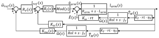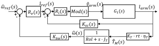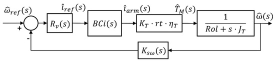 The control loop together with the blocks diagram explained in Figure 2 and Figure 6 is shown in Figure 7. Ri(s) is the transfer function of the current compensator, Mod(s) includes both the modulator and the motor drive power stage, and Rv(s) is the transfer function of the speed compensator. Finally, the terms Ksc(s) and Ksω(s) are the gain related to the internal current loop sensor and external speed loop sensor, respectively. The reference signal is the driving profile, ωref(s).