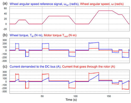 As can be seen in Figure 13, the speed increments or decrements imply positive or negative motor torque, which involve positive or negative currents in the rotor. Thus, using the carried out modeling a driving profile can be transformed into a current profile that has to be supplied by the power distribution system from the DC bus.