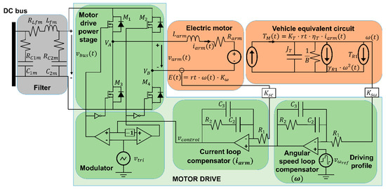 Afterward, once the motor drive averaged model is known, the motor drive-electric motor-vehicle system averaged model can be obtained. The model, shown in Figure 16, uses the previously claimed assumptions.