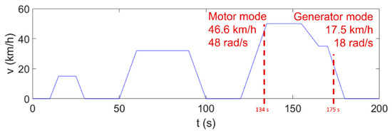 The working point W is chosen using a standard driving profile. This profile depends on the vehicle and the driving pattern used. As commented before, the driving profile chosen is the Urban Driving Cycle (UDC or ECE-15), which represents the typical driving conditions of busy European cities, with 50 km/h maximum speed. The working points in both motor and generator mode are shown in Figure 22, and the corresponding data is shown in Table 4.