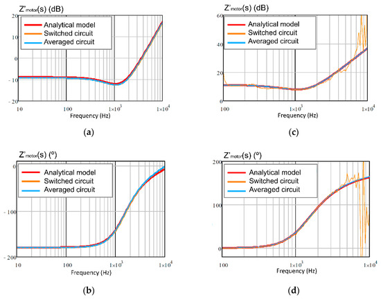 Next, the frequency response of the small-signal input impedance obtained by three different methods are shown in Figure 23a,b for motor mode, and in Figure 23c,d for generator mode. The first method is the frequency response obtained with the averaged circuit, shown in Figure 16, by using Equations (46) and (47). The second method is the frequency response obtained from the switched circuit, shown in Figure 14. The third method is the frequency response obtained from the small-signal analytical model, shown in Figure 17, by using Equations (49) and (50).