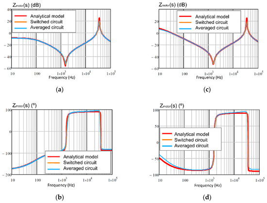 The frequency responses of the small-signal input impedance, Zmotor(s), are shown in Figure 25a,b for motor mode, and in Figure 25c,d for generator mode. Figure 25 shows the averaged circuit, shown in Figure 16, using Equations (46) and (47); the switched circuit, shown in Figure 14; and the small-signal analytical model, shown in Figure 17, using Equations (49) and (50).