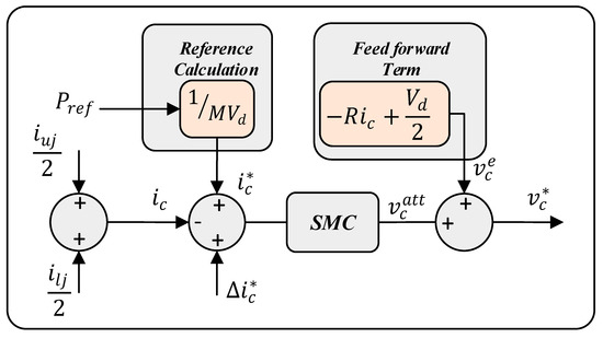 Equations (7) and (8) characterize the dynamics of MMC. By analyzing Equation (7), it is concluded that as v j is AC bus voltage, only v s , j can be manipulated to control outputhe t current i o , j . Similarly, Equation (8) is used to control the circulating current dynamics of MMC. Likewise, in Equation (8), i c , j can be controlled by manipulation of the internal voltage v c , j . Moreover, the internal dynamics of the SM capacitor also has a great effect on the circulating current. It is represented in terms of arm voltages and arm currents as