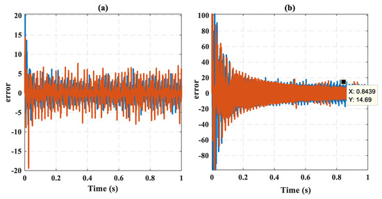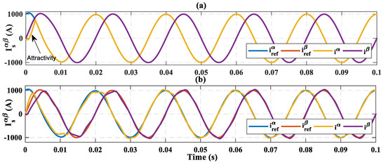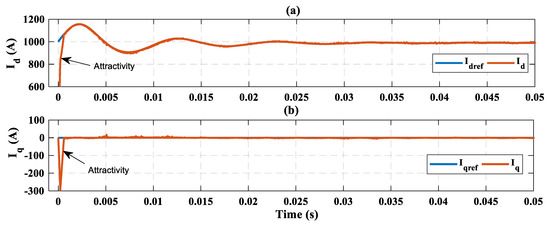 The first terms in Equations (24) and (25) represent the equivalent voltage vector. The equivalent voltage vector is active during steady-state, and it will steer the system trajectory onto the sliding manifold, while later terms in Equations (24) and (25) represent attractive voltage that is active in the transient state. The attractive term forces the system trajectory to the sliding surface. The error for both d-axis and q-axis current is defined as
