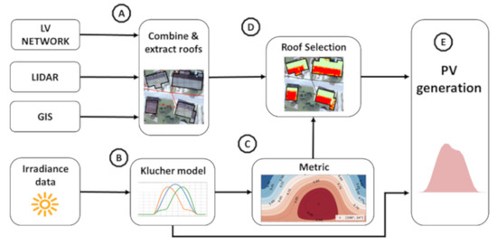 In comparison with other approaches, the proposed method extends the current input data with actual building roof data. This has become possible with the availability of new data sources. With 3D-point cloud data derived from light detection and ranging (LIDAR) and land register geographic information system (GIS) data, it is possible to form 3D roof models. Further, the solar irradiance for every roof can be determined by using actual tilts and orientations of particular roof surfaces. This enables the calculation of PV system nominal power and stochastic generation for every roof from solar irradiance measurements.
