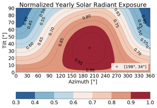 After the appropriate network and roof modeling, solar radiant exposure for every roof was calculated. This enabled assessment of the solar potential of the analyzed rural network (village) and selection of the roofs that had high PV potential, which will be used in further analyses as described in Section 2.2. As described in Section 2.2.2, the normalized column vector Hnorm was calculated. Here, the vector Hnorm is reshaped to a matrix having orientation values on x-axis and tilt values on y-axis, so that the resulting matrix for a chosen area can be plotted (shown in in Figure 3). In order to receive as much radiant exposure as possible, it is important to have a slightly west oriented PV panel. The optimal position around the analyzed weather station was at azimuth 198° and tilt 34°. In order for the surface to receive at least 90% of the maximal yearly radiant exposure (red color), there were a wide range of tilt-orientation (azimuth) combinations available. The authors in Reference [37] performed a national study of solar energy in Slovenia and came up with similar results.