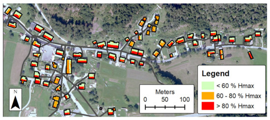 The solar potential for the analyzed village for a part of the chosen LV network is presented in Figure 4. Every color represents the normalized yearly radiant exposure that a particular polygon receives, depending on an optimal yearly radiant exposure, as presented in Figure 3. Red denotes that a particular surface has at least 80% of the optimal yearly radiance exposure; thus, those were the most suitable roof surfaces (mostly south-facing parts of the roofs), followed by the orange, which was within 60–80%. Finally, the light green color indicates the surfaces which were the least suitable for PV placement. As defined by the methodology proposed in Section 2.2.2, PV panels were placed only on the roof surfaces that were most suitable for PV placement and colored with red in Figure 4.