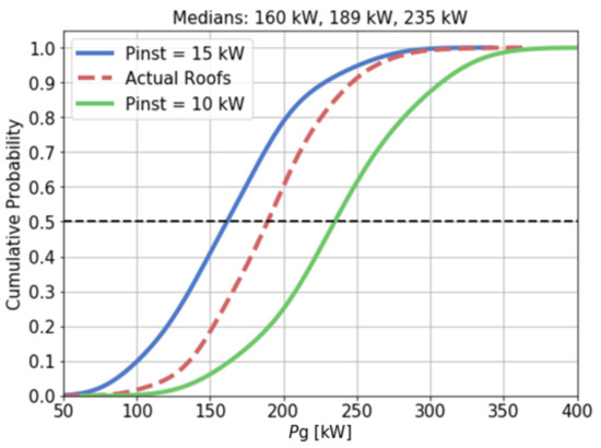 Since it is easier to examine the quantiles of the sample from a cumulative histogram, we show it in Figure 6. The label “actual roofs” refers to our proposed methodology using actual building roof surfaces. The median PV hosting capacity is 189 kW. The values on the left part of the graph are buildings that are far from the transformer station and have a greater impact on the network voltages due to lesser short circuit apparent power. On the other hand, the values on the right of the graph are the buildings near the transformer station.