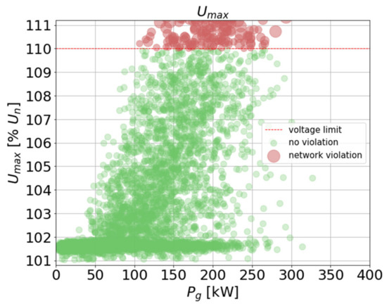 The maximal voltage in the LV network for every simulation is represented with a circle, which is colored depending on violations. Green represents simulations without network violations, and red represents the simulations where violations occurred. The sizes of the red circles are correlated to the number of violations. It can be seen that violations started to occur when the total installed power of PV was around 100 kW.