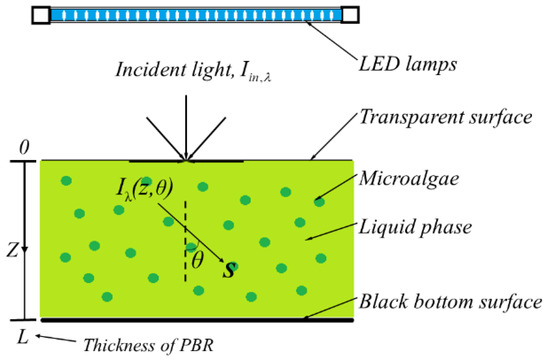 The boundary conditions are of great importance in solving the RTE in simulation. Assuming that the boundary of PBR is completely transmitted, and mismatch of the refractive index between the disperse medium and air is neglected, the PBR is considered to be horizontally placed. As can be seen in Figure 1, illumination only is from the top with a diffuse light, and the back surface is considered to be cold and black. Thus, the boundary conditions of RTE can be written as: