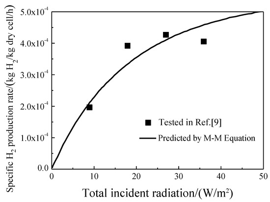Thus, the Michaelis-Menten equation is used to describe the relationship between local incident radiation and hydrogen productivity in the present study. It was proposed as follows [24] (pp. 254–268):