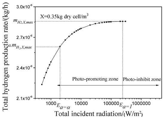 As shown in Figure 3, it can be seen that when the concentration of microalgae is constant in the PBR, the total hydrogen production rate of the PBR system increases with the enhancement of light intensity in the photo-promoting zone, and an opposite trend presents itself in the photo-inhibiting zone. It is apparent that there is a working condition point of maximum total photosynthetic effective hydrogen production rate at the boundary of photo-inhibiting and photo-promoting zones. In order to present the potential of hydrogen production at a certain cell concentration, the ratio of the total hydrogen production rate in the photo-promoting zone and the maximum total hydrogen production rate at a certain microalgae concentration X is defined as the dimensionless hydrogen production rate at microalgae concentration X as a performance parameter. It can be written as: