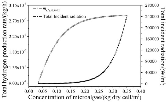 The curves of total incident radiation and total hydrogen production rate varying with the concentration of microalgae at α = 1.